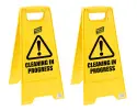 The Standard Wet Floor Sign (Cleaning In Progress) is a great value double sided A frame sign to warn against potential hazards from wet floor surfaces during and after cleaning or spillages. Made from vivid yellow plastic, no assembly needed, folds flat for easy storage.