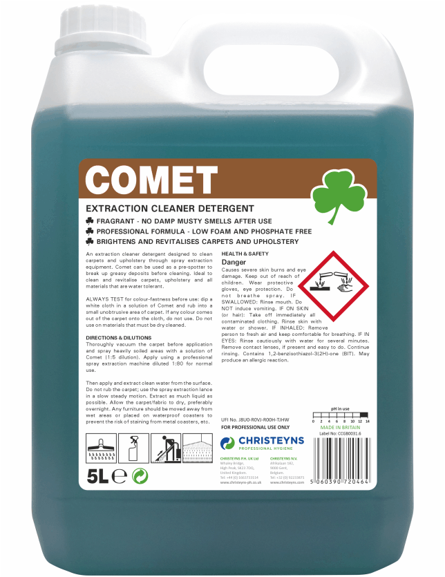 A low foam, clear, green liquid, Comet can also be used as a pre-spotter for breaking up greasy deposits before cleaning.