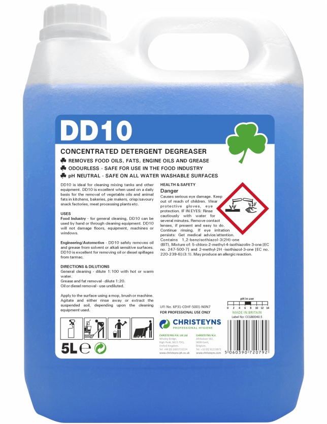 Recommended for use throughout the food industry; kitchens, bakeries, pie-making, savoury snack factories and meat processing plants. DD10 is used in garages and engineering works to clean floors, equipment, fixtures and fittings.