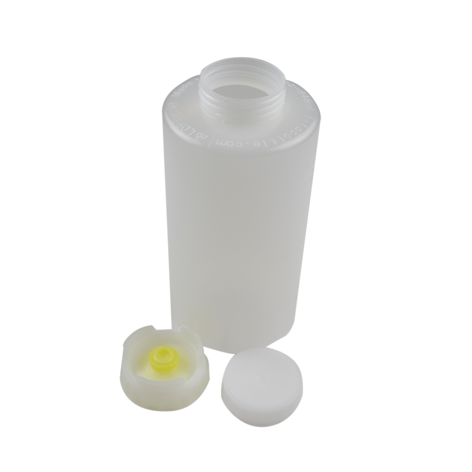 This “First In, First Out” (FIFO) 946ml bottle features a medium valve dispensing cap and top cap.
