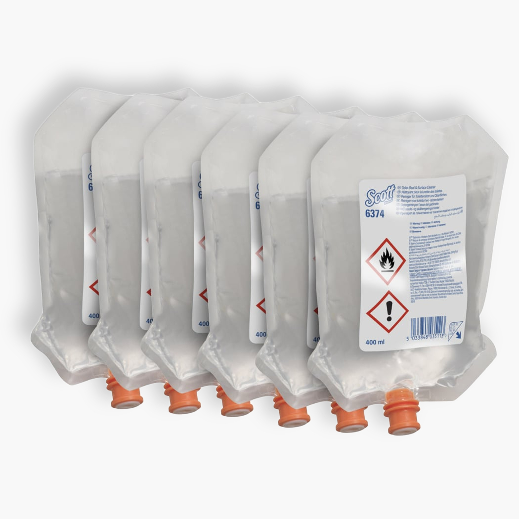 Scott® Toilet Seat & Surface Cleaner is designed for efficient, reliable cleaning in busy washrooms. This easy-to-use cleaner offers controlled shots of clear spray, ensuring hygiene and convenience. The hygienically sealed pouches are quick to install, and each delivers 2,000 shots, providing a more pleasant and hygienic experience for users.