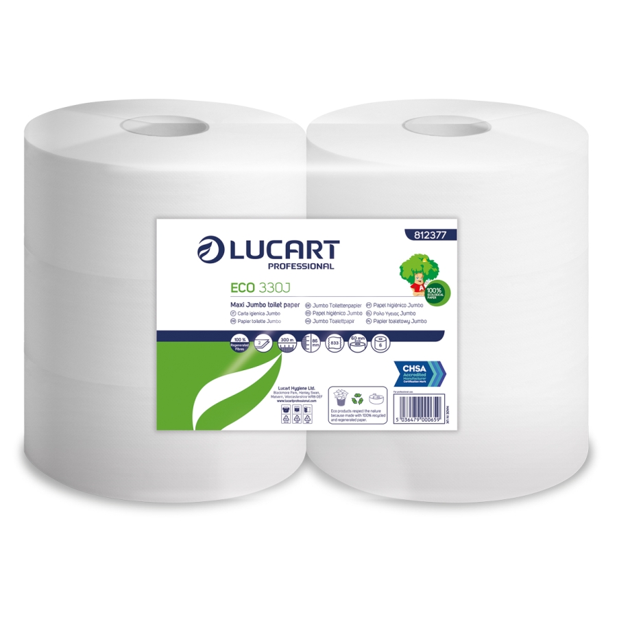 Lucart Eco 330J Maxi Jumbo Toilet Rolls provide a reliable and environmentally responsible washroom solution for high-traffic commercial environments. Made from recycled fibres, these 2-ply jumbo rolls deliver excellent durability and absorbency while reducing refill frequency thanks to their high roll length.